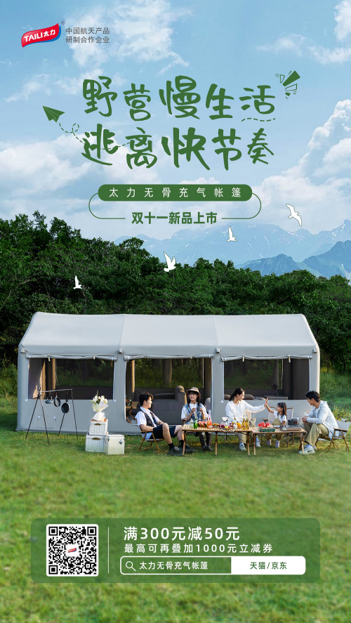 在这个全球购物狂欢节里,太力户外品牌将新品“无骨充气帐篷”及露营周边产品充气沙发、充气床垫、天幕、露营车充气户外帐篷、蛋卷桌、折叠椅、毛毯等等的上市时间定为10月31日晚8点,与天猫双11开门红同步开启,并且同步推出满300元减50元活动,最高叠加1000元优惠券,以最有诚意的尝鲜价格力度助消费者获得全新露营体验。