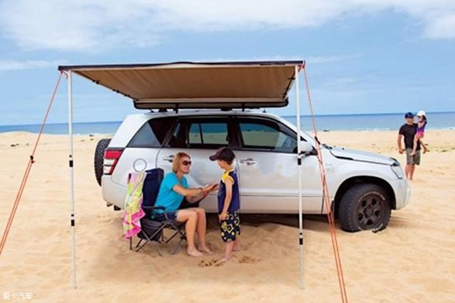 车载帐篷分几种,首先是最简单的遮阳棚。遮阳棚通常适合安在比较长、高的旅行车侧面,有些SUV也没问题。这种棚子能起到很好的遮光挡土挡雨效果,让我们可以在它下面乘凉休息车用帐篷。