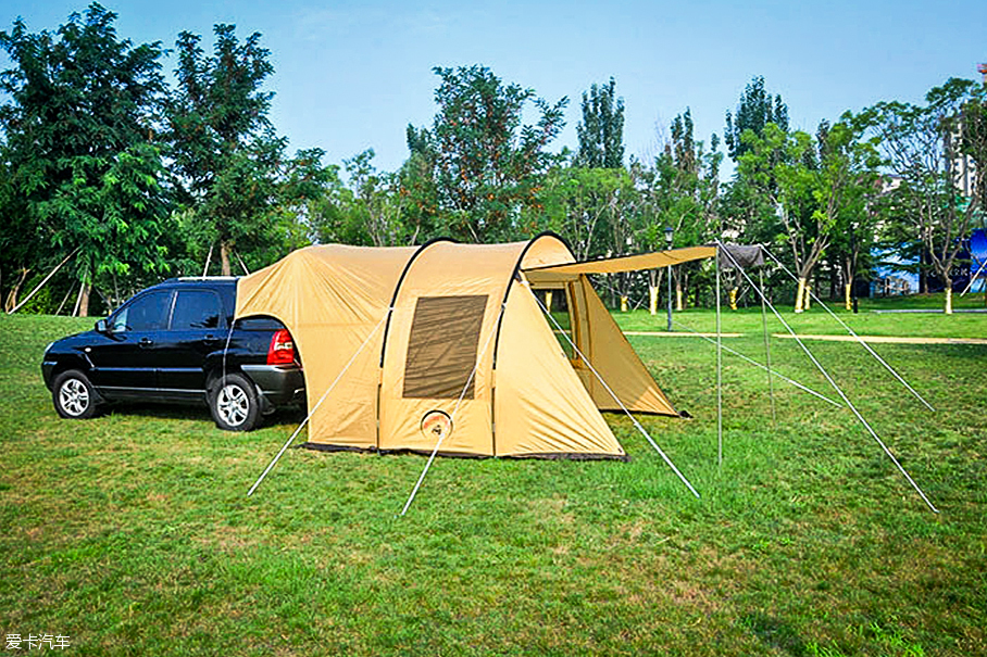 通常这种帐篷都是为了增加露营者的室内空间。而大家睡觉还都是在车里。这种帐篷有大有小,基本都是手搭模式,很少有电动版。